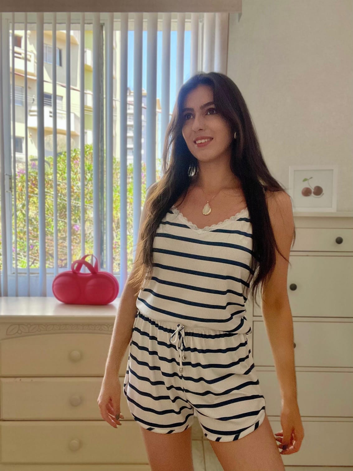 Short doll malha canelada de alças finas listrado na cor marinho fundo off