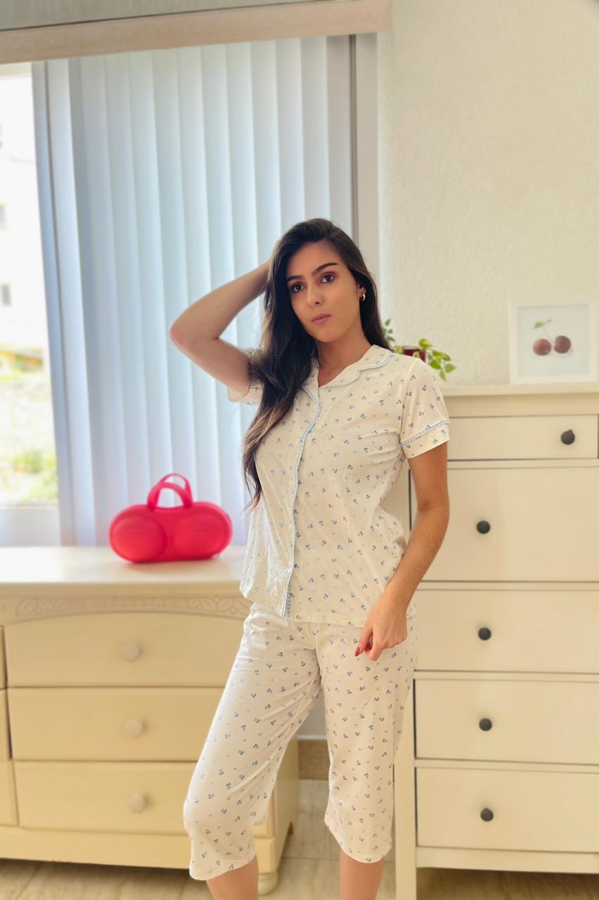 Pijama com botões estampa floral azul com detalhe viés azul e com fundo branco. Pijama com calça pescador