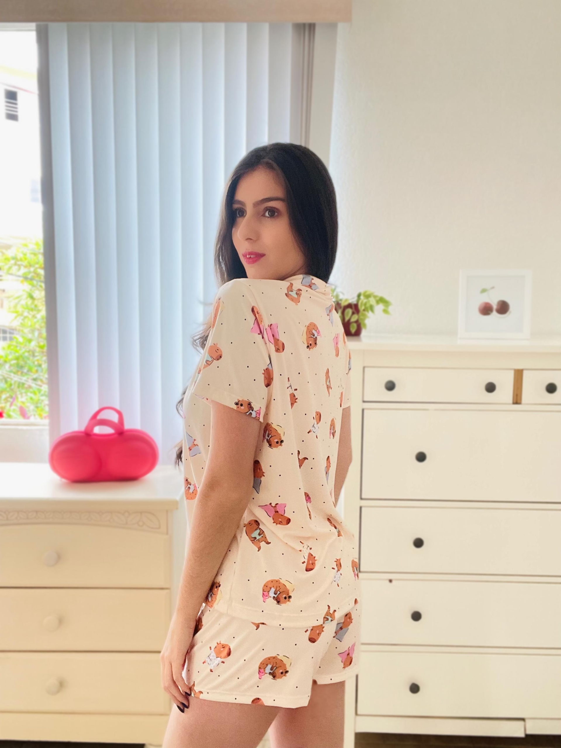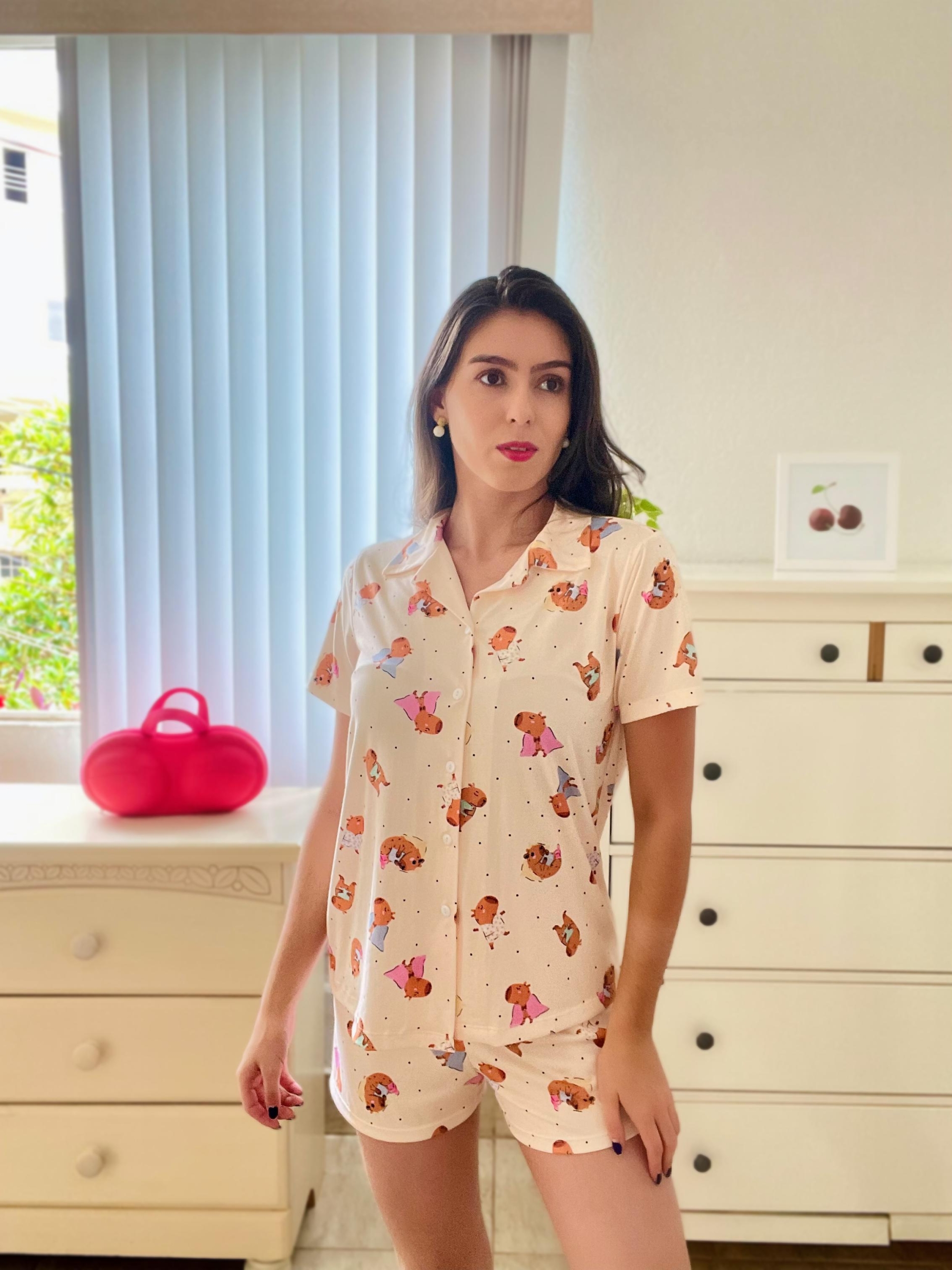 Pijama com botões na estampa de capivara fundo areia