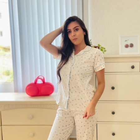 Pijama americano com botões estampa de frutas cor fundo off e laranjinhas