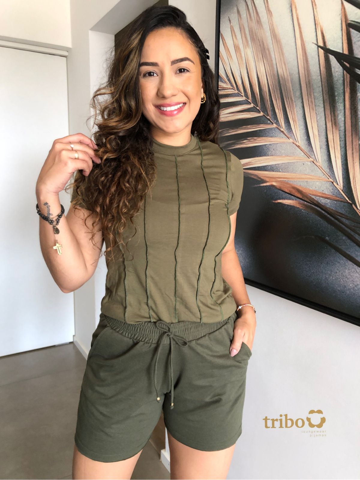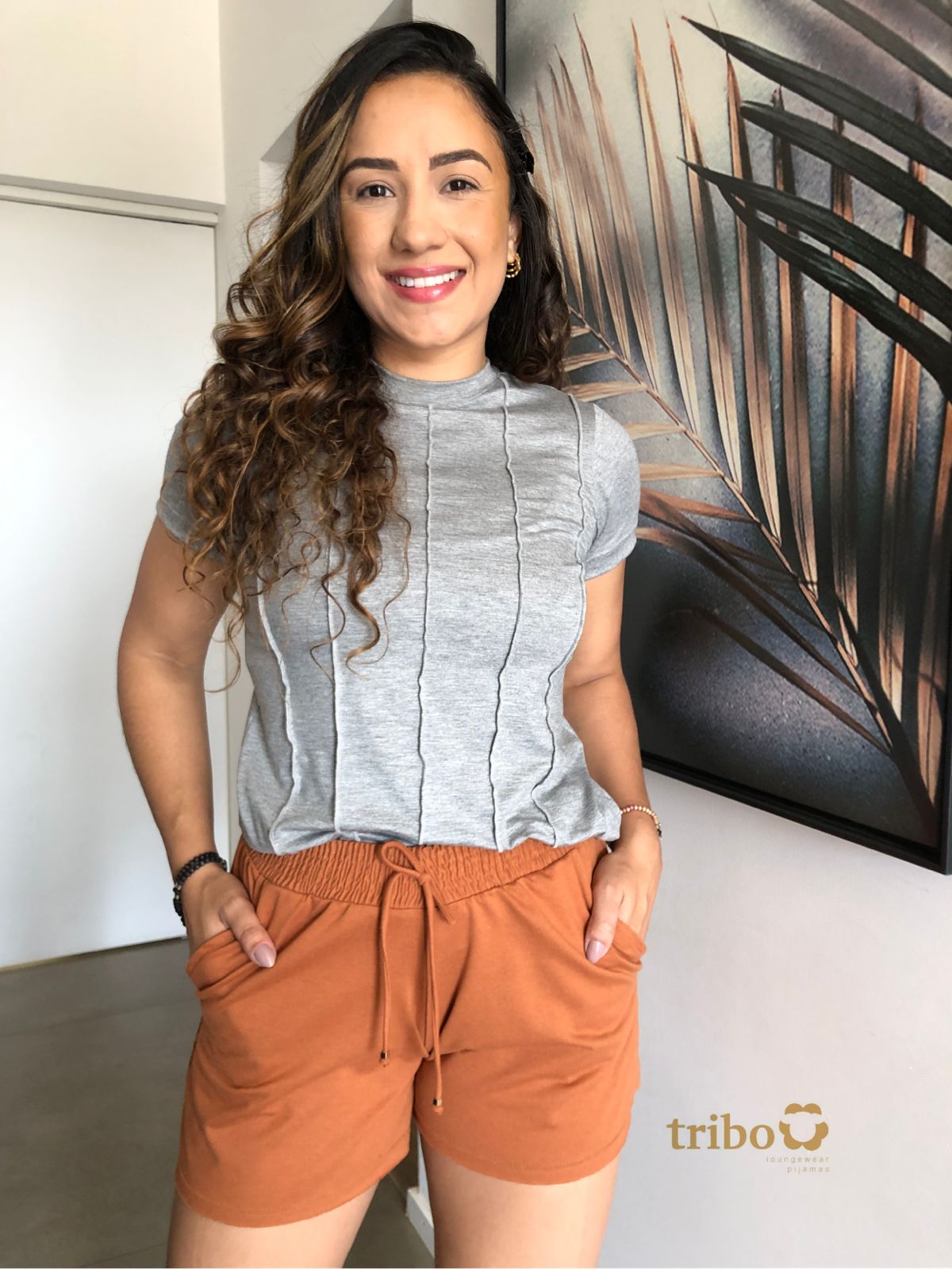Pijama com t-shirt confeccionada em viscolycra com gola redonda e com detalhes de frisos e short em moletinho com bolsos e falso amarrador roliço com ponteiras.