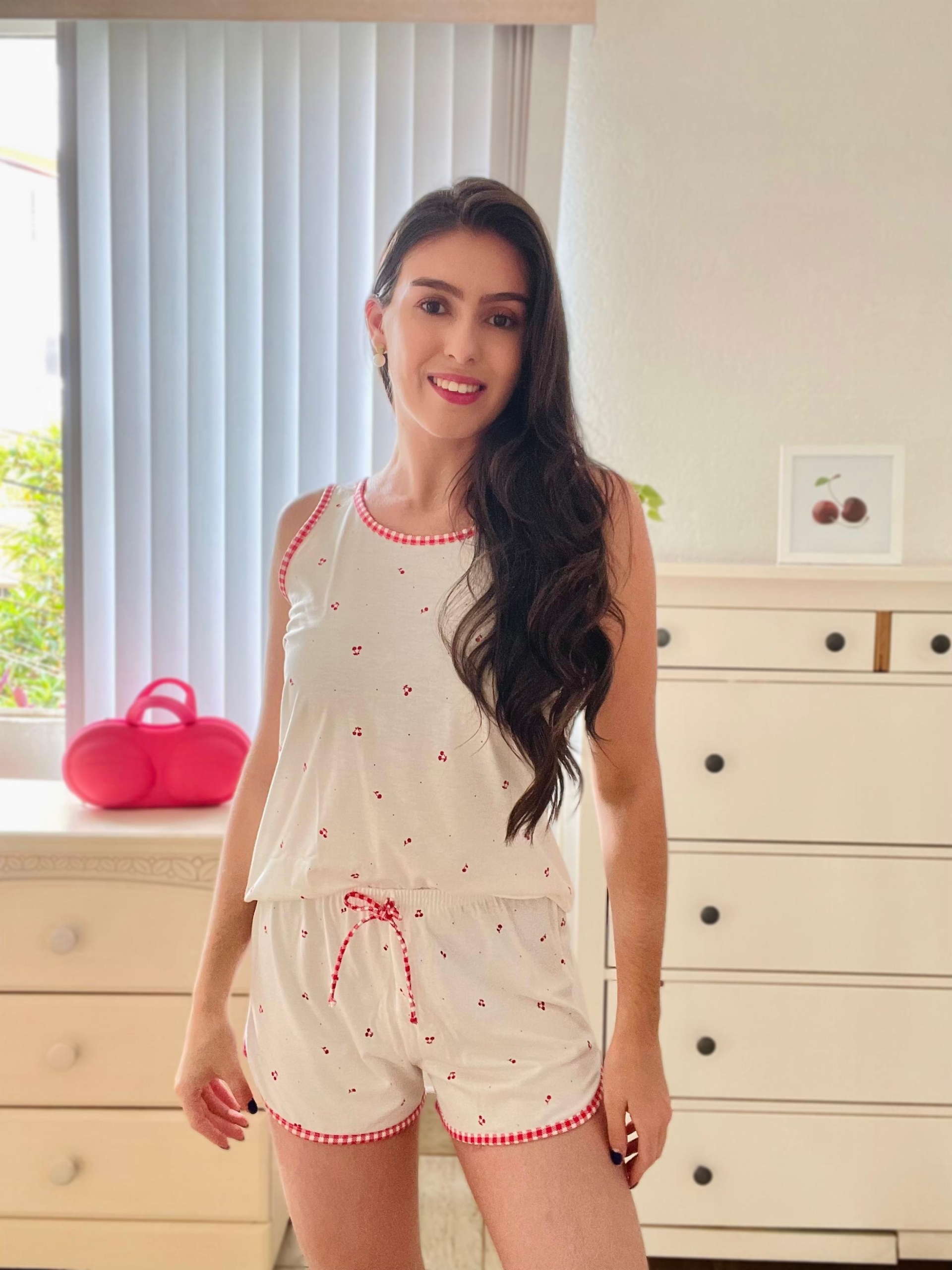Pijama regata fundo off e estampa de cerejinhas com detalhe de viés xadrezinho vermelho
