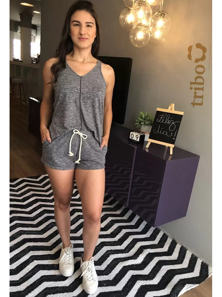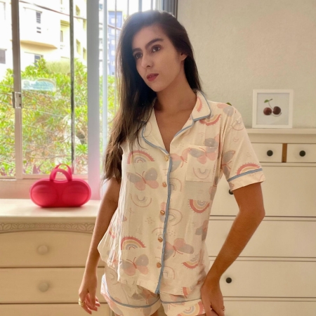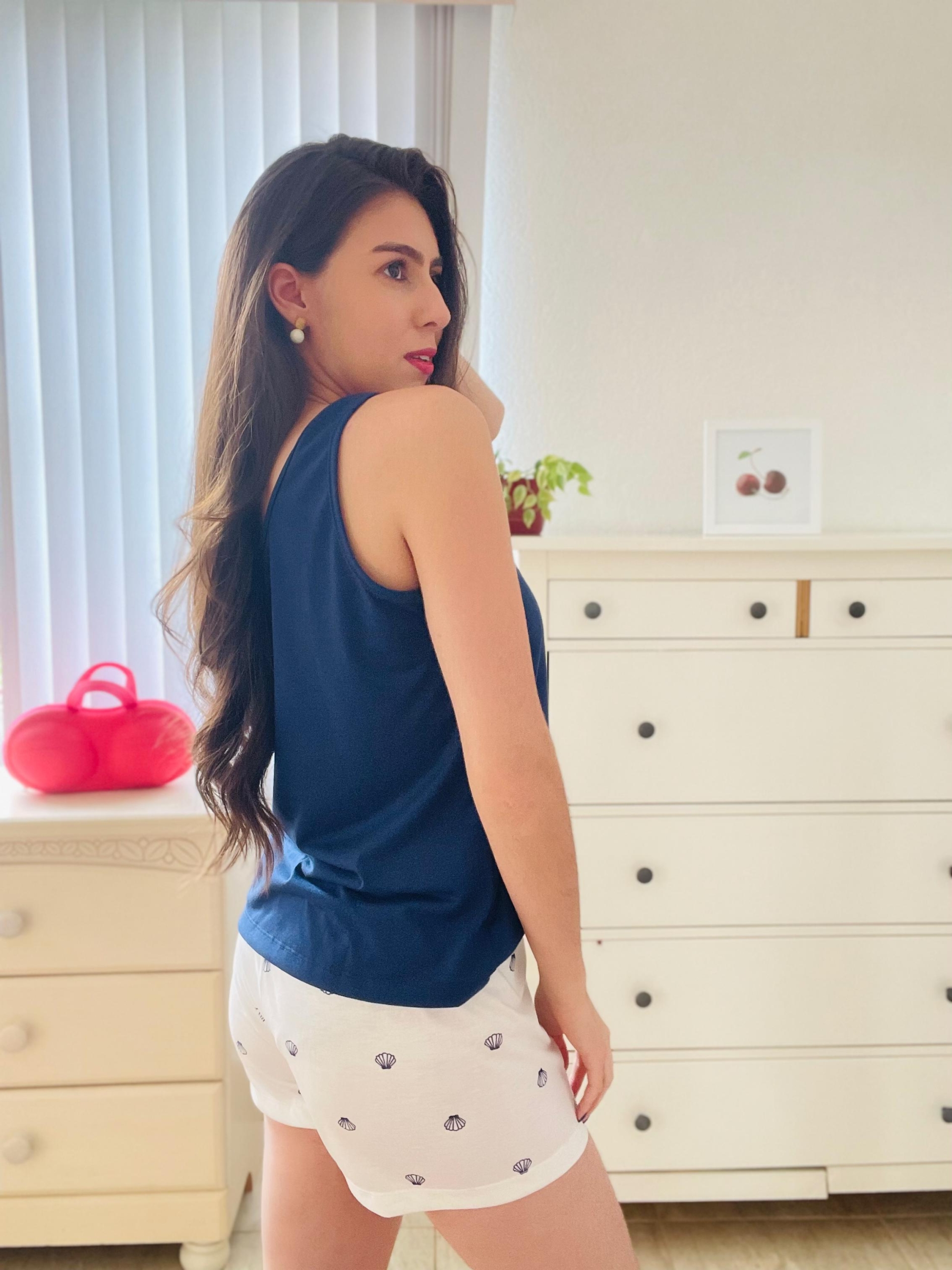 Pijama regata com aplique de concha na cor marinho com a frase (Maré de coisas boas) e shorts com amarração com fundo off de estampa de conchinhas.